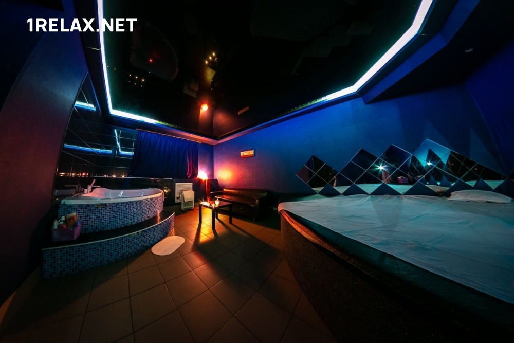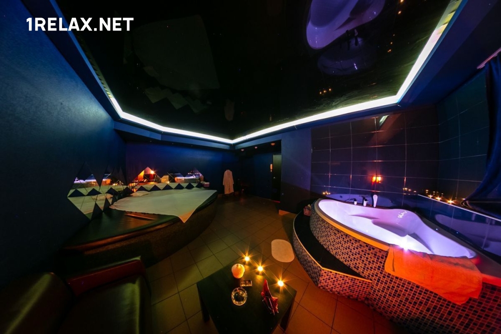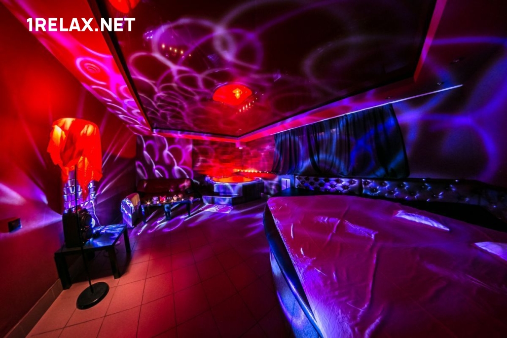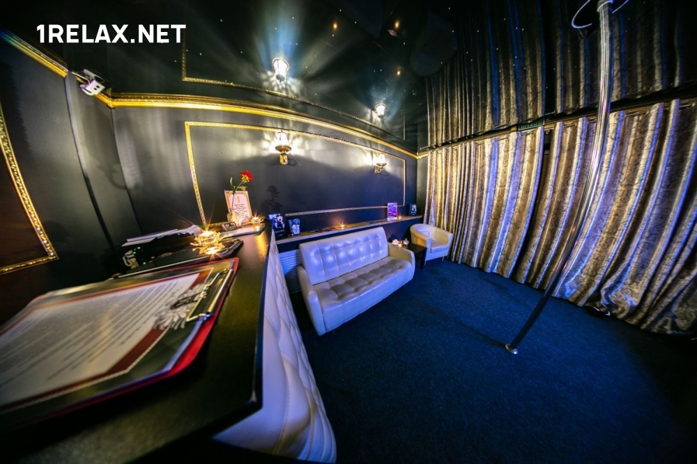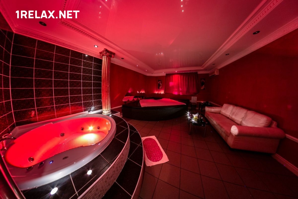 В салоне четыре комнаты, в каждой из которых вы найдете кровать, диван, шест для стриптиза, телевизор и кондиционер. Есть душ и джакузи.